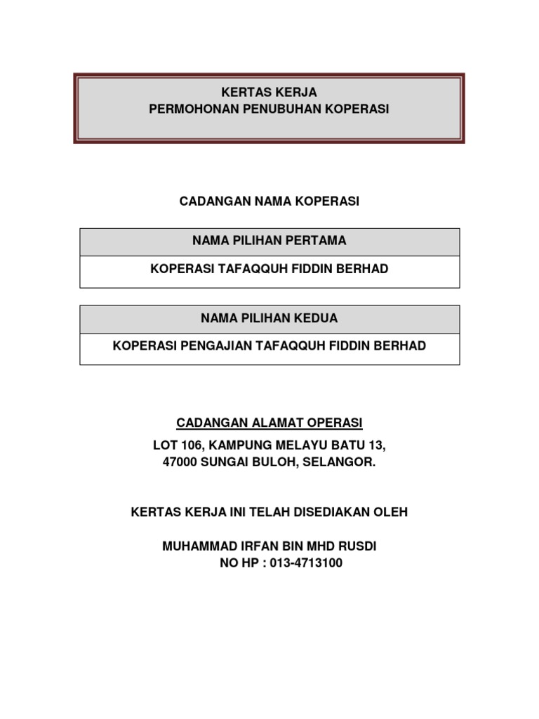 Text of contoh kertas kerja rancangan perniagaan koperasi. Koperasi warga tok ayah haji wan muhammad tahwm didirikan atas dasar kekeluargaan kesukarelawan dan semangat. Kertas cadangan bagi penubuhan koperasi hj.